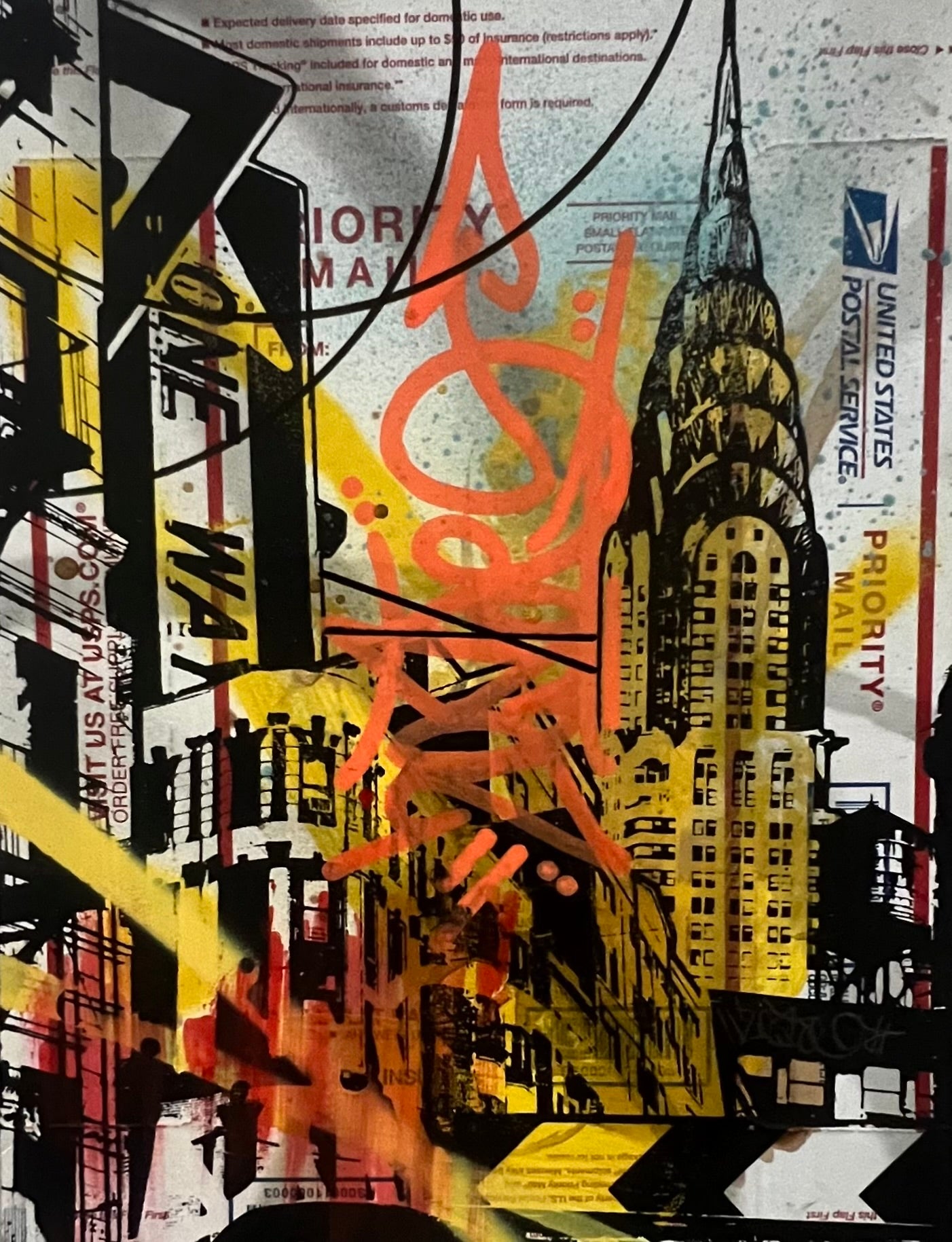 One of a kind hand pulled and embellished screenprint on usps issued cardboard packaging. Signed by artist. Each piece comes packed in folder with stickers.