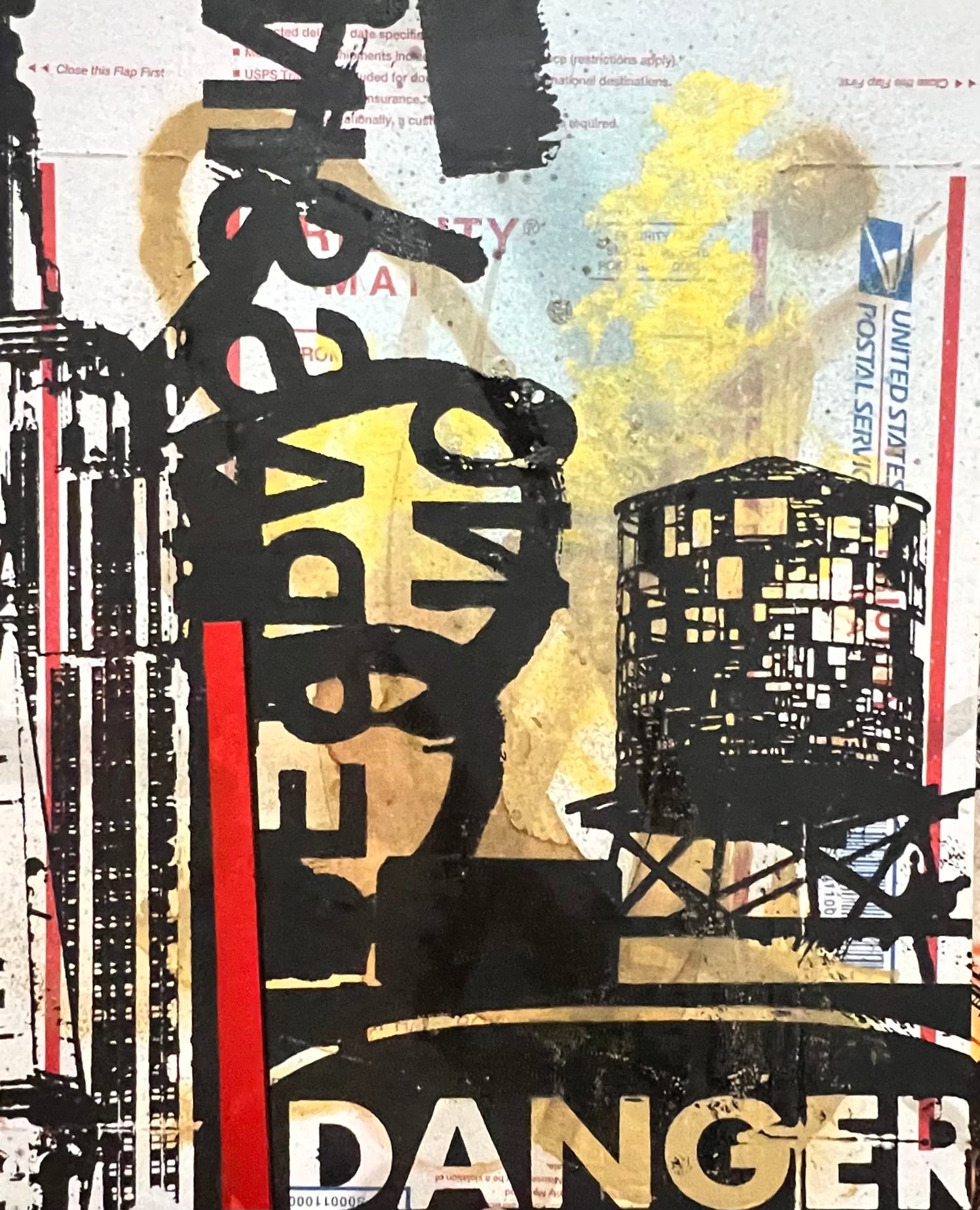 One of a kind hand pulled and embellished screenprint on usps issued cardboard packaging. Signed by artist. Each piece comes packed in folder with stickers.